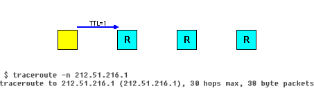 - Pierwsze dwa kroki są powtarzane wiele razy, jednak pole TTL za każdym razem jest ustawione na wartość o 1 większą. W każdym cyklu odpowiedź ICMP jest zwracana przez kolejne routery znajdujące się po drodze do celu. Trasę, którą pokonuje pakiet wysyłany do celu można rozpoznać po adresach IP, z których przychodzą kolejne komunikaty ICMP.