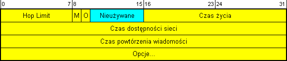 W pierwszym polu wiadomości zawarta jest domyślna wartość Hop Count jaka powinna być umieszczana w nagłówkach IPv6 pakietów wysyłanych do sieci. Kolejne dwie flagi ustawione na wartość 1 oznaczają, że urządzenia używają ustalonych protokołów do uzyskiwania informacji o sieci. Pole czasu życia zgłoszenia jest informacją dla urządzeń, przez ile sekund router będzie jeszcze dla nich dostępny. Czas dostępności sieci oznacza, przez ile milisekund po otrzymaniu potwierdzenia, router będzie przyjmował, że jest podłączony do sieci. Czas powtórzenia wiadomości oznacza co ile milisekund router wysyła komunikat Router Advertisement.