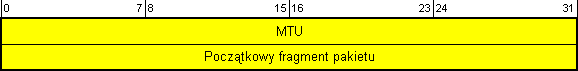 ![]() Komunikat ten jest wysyłany przez router wówczas, gdy jakiś pakiet nie mogł zostać przesłany do kolejnego urządzenia na drodze do celu. Wiadomość ta jest odpowiedzią oznaczającą, że przesyłany pakiet był większy niż MTU (Maximum Transmission Unit) łącza. Wartość MTU łącza, przez które pakiet nie mógł być wysłany umieszczana jest w odpowiednim polu komunikatu. Wiadomość ta, w odróżnieniu do pozostałych komunikatów o błędach ICMPv6, jest wysyłana również jako odpowiedź na: